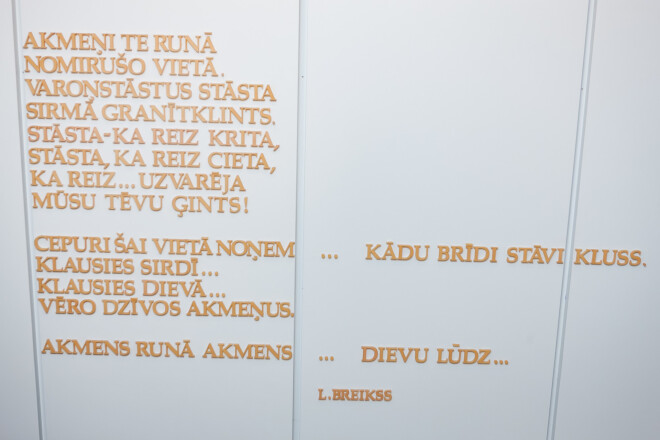 Telpas labajā pusē uz sienas lasāmas latviešu dzejnieka un žurnālista Leonīda Breikša (1908.-1942.) vārsmas.
