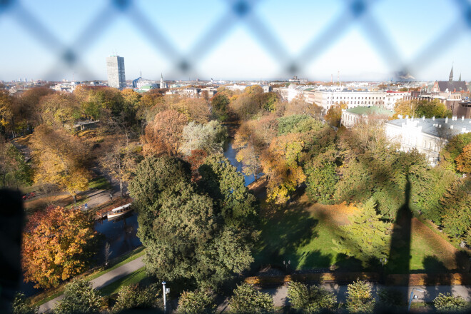 Tieši zem 9 metru garā no vara veidotā brīvības tēla šaurā telpā ierīkoti divi restoti lodziņi, pa kuriem skatam paveras visa Rīga.