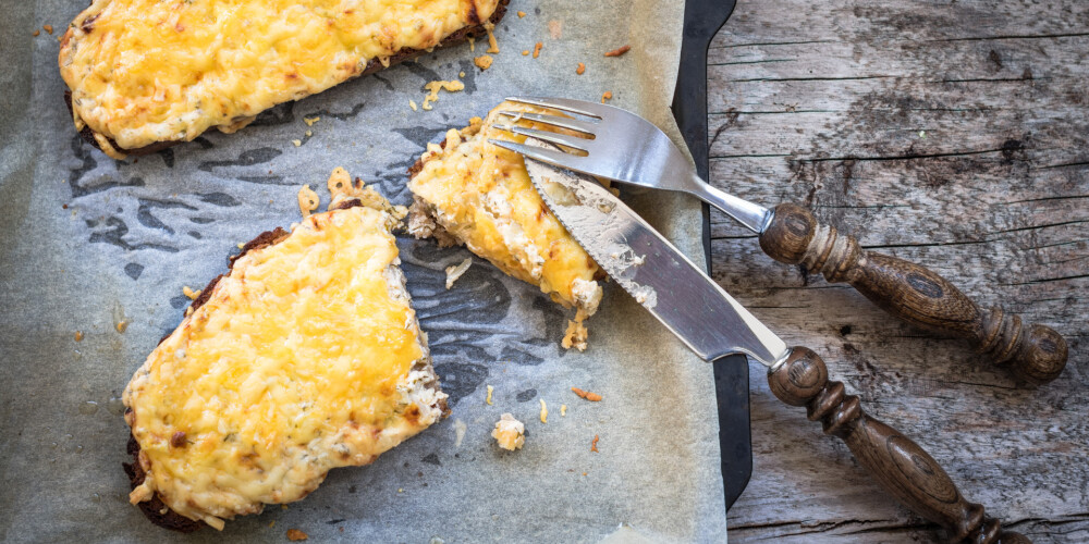 Bagātīgi pārklāj maizes šķēles ar siera masu. Cep aptuveni 10 minūtes, līdz veidojas zeltaini brūna garoziņa. Pasniedz karstas.