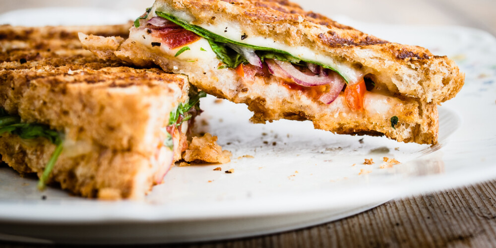 Uzsildi cepeškrāsni uz 200 grādiem. Katru maizes šķēli no vienas puses apsmērē ar sviestu. Liec četras maizītes uz virsmas ar sviesta pusi uz leju. Virspusi pārsmērē ar pesto, virsū kārto mocarellas šķēlītes, šķiņķi un pārkaisi ar sieru. Pārklāj ar atlikušajām maizes šķēlēm, liekot tās ar sviestu uz augšu. Ar virtuves lāpstiņu saplacini tās.