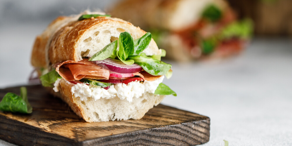 Vienu bagetes pusi apzied ar sieru, uzliec šķiņķi un uzkaisi zaļumus. Uzliec virsū otru bagetes pusi un viegli piespied.