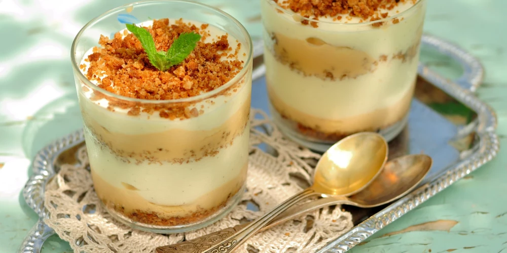 Burciņas apakšā liec cepumus, tad karamelizētos banānus, pa virsu putukrējumu.
