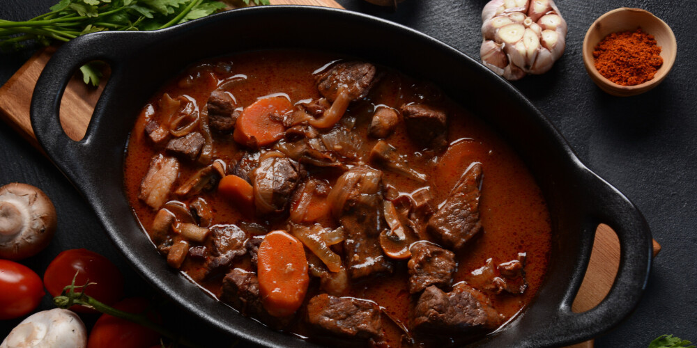 Pielej vīnu un pamazām ik pa laikam lej klāt arī 1 l karsta ūdens. Uz lēnas uguns sautē aptuveni 2,5 stundas.