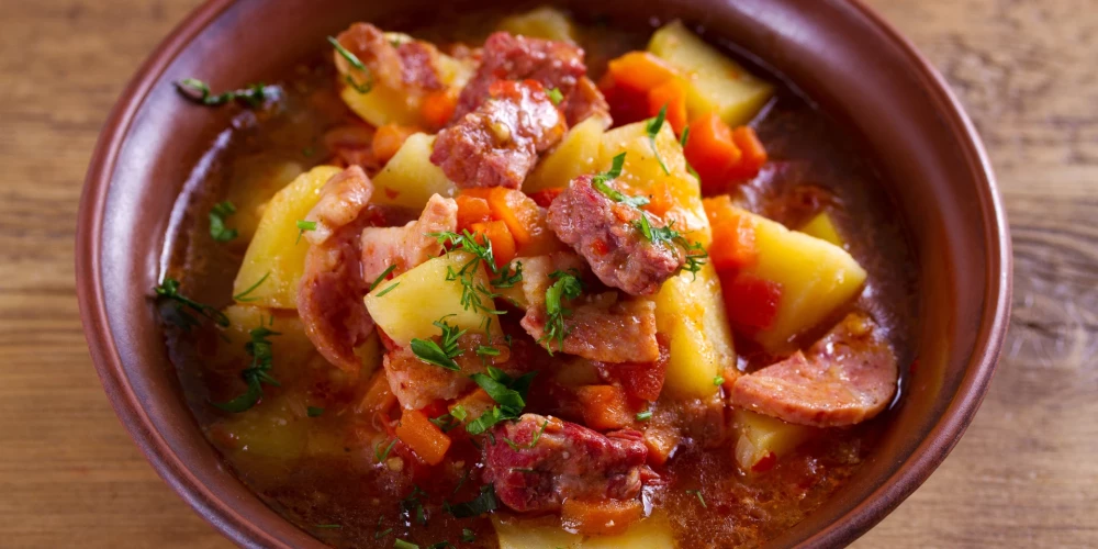 Tad liec katlā papriku un kartupeļus. Samazini uguni un turpini sutināt, līdz kartupeļi mīksti. Pagaršo, vai nevajag sāli vai piparus. Pasniedz ar karoti skāba krējuma un sakapātiem zaļumiem.