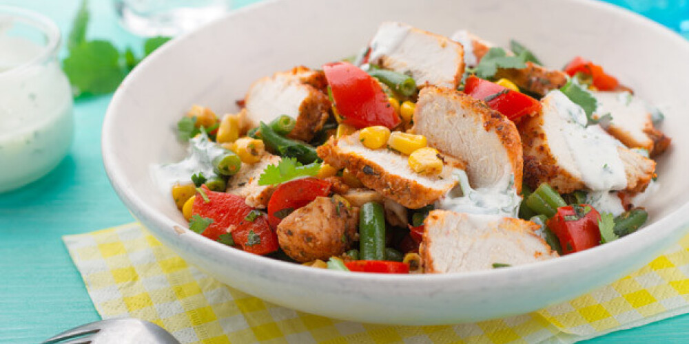 Porcijas šķīvjos kārto dārzēnus, pa virsu sagrieztu fileju un pārlej ar mērci/