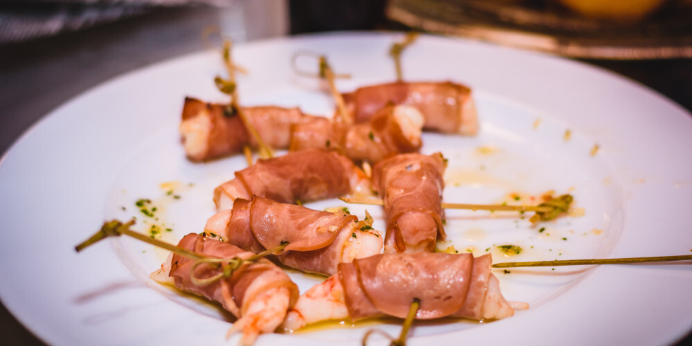 Katru garneli ietin bekona šķēlē un cep uz grila, ik pa brīdim apgrozot, kamēr garneles maina krāsu uz rozā.