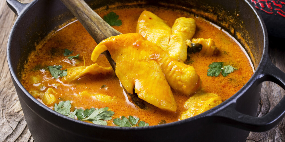 Pannā sakarsē eļļu, tajā izšķīdini karija pastu. Pielej kokosriekstu pienu un ūdeni un uzvāri.