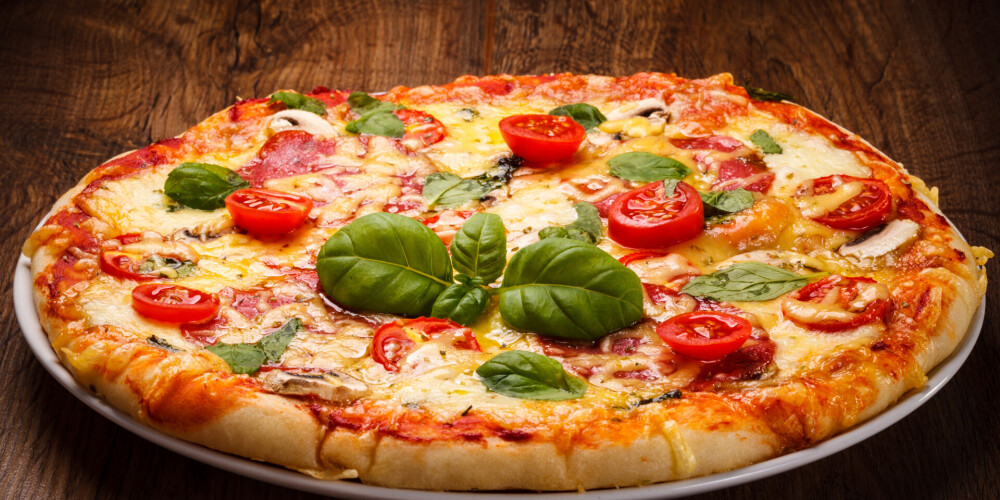 Liek cepties ļoti karstā krāsnī un cep, kamēr picas maliņas ir apbrūnējušas, aptuveni 12-15 minūtes. Kad gatava, pārkaisi ar baziliku.