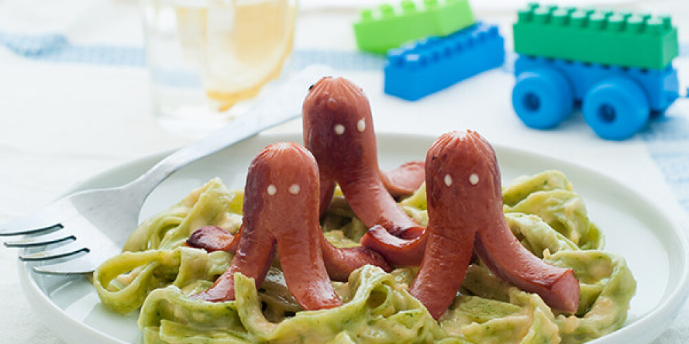 Pastu kārto šķīvī un pa virsu izliek astoņkājīšus.