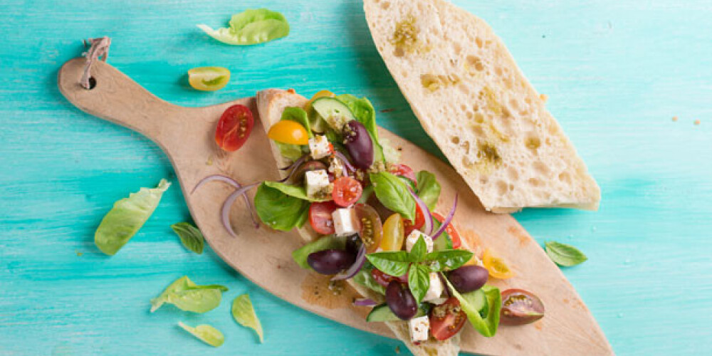 Bageti sagriezt uz pusēm un tad vēlreiz gareniski uz pusēm. Pesto mērci sajaukt ar olīveļļu un iesmērēt maizītes. Uz divām maizītēm saliek pa virsu visus labumus - salātlapas, sagrieztus tomātiņus un gurķus, sīpolus, olīves, sieru. Tad visu pārkaisa ar sāli un svaigi maltiem pipariem pēc garšas un mazliet pārlej ar pagatavoto mērci. Tad apsedz ar atlikušām maizes pusītēm un sanāks gards sendvičs. Bet var arī pārlikt šķīvī un ēst ar nazi un dakšu.