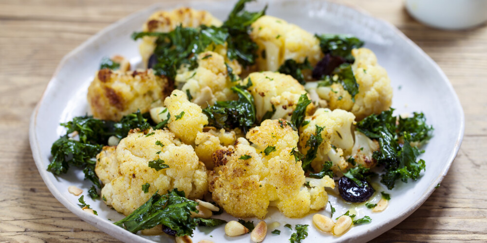 Sadali ziedkāpostu mazākās ziedkopās. Cepamajā pannā ieklāj cepampapīru, liec uz tās ziedkāpostus. Apslaki tos ar eļļu, pārkaisi sāli un piparus. Cep 200 grādos apmēram 30 minūtes līdz tie kļūst zeltaini brūni un kraukšķīgi.