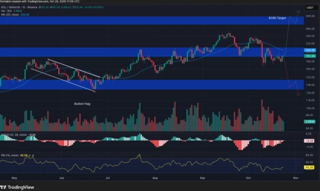 Pēc kāpuma līdz 250 ASV dolāriem janvārī un krituma līdz 100 ASV dolāriem aprīlī, SOL pašlaik tiek tirgots ap 191 dolāru, kas liecina par atjaunotu augšupejas potenciālu. Ar RSI ap 45 un cenu zem 30 dienu mainīgā vidējā, tokens izskatās nepietiekami novērtēts.