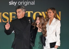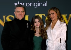 Robijs Viljamss ar sievu Aīdu Fīldu un meitu Tediju filmas “Tinsel Town” pirmizrādes vakarā 2025. gada 27. novembrī Londonā.