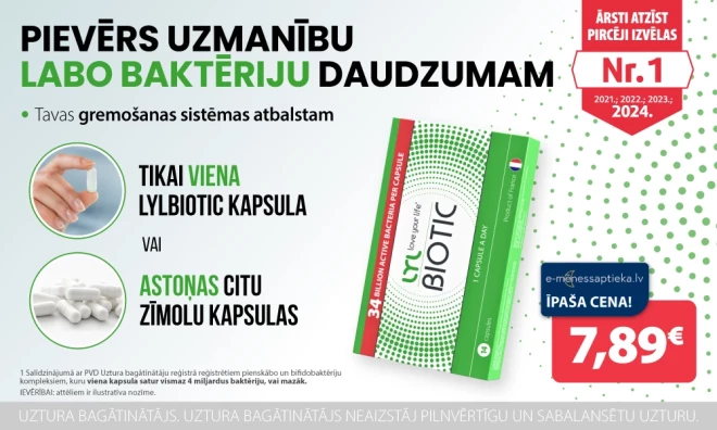 Kad jautāju dermatoloģei, kuras labās baktērijas būtu man visatbilstošākās, viņa ieteica pašmāju farmācijas zīmola LYL love your life® ražotās LYLBIOTIC, jo šīs labās baktērijas iesaka ārsti un gastroenterologi, balstoties uz klīnisko un zinātnisko pētījumu rezultātiem. Turklāt šim labo baktēriju kompleksam tikai vienā kapsulā (dienas deva) ir iekļauts superliels baktēriju skaits – 34 miljardi. Speciāliste uzsvēra, ka liela ir arī baktēriju daudzveidība – astoņas sugas –, un tās ir identiskas baktērijām, kas mīt cilvēka organismā. Turklāt sastāvā ir unikālās Saccharomyces boulardii rauga šūnas.
