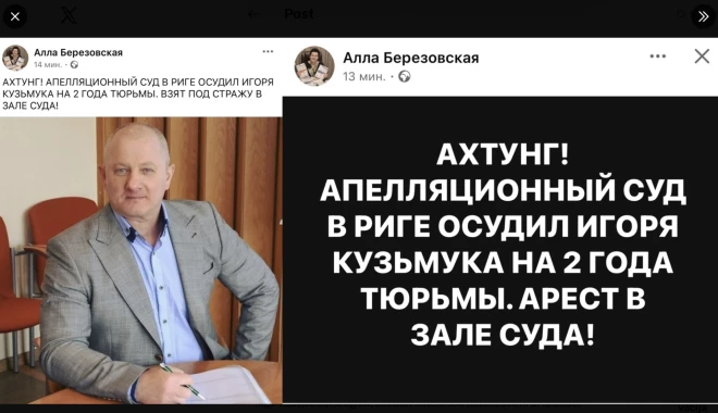 Kā soctīklos ziņo prokremliskā aktīviste Alla Berezovska, šodien Rīgas apelācijas tiesa piesprieda Igoram Kuzmukam 2 gadus reāla cietumsoda, un viņš tika apcietināts tiesas zālē.
