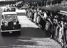 1935. gada 18. novembrī tūkstošiem latviešu Valsts prezidenta un valdības vadītāja kortežu uz Brīvības pieminekļa atklāšanu sveicina ar izstieptu labo roku.
