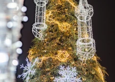 Majestātiskajā svētku eglē šogad mirdz smalkas, zeltainas gaismu virtenes. Tās papildina lieli akcenti – spožas, zeltainas atslēgas un baltas sniegpārslas, radot svinīgu un greznu iespaidu. Rotājumu ansambli noslēdz egles galotnē starojoša zvaigzne un iespaidīgi torņi, kas harmoniski sasaucas ar bagātīgi izgaismoto sētu, kas egli ieskauj.