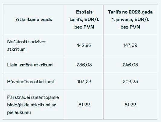- par nešķirotu sadzīves atkritumu apsaimniekošanu – 32,60 EUR/m³ bez PVN jeb 39,45 EUR/m³ ar PVN 21% (līdz šim – 38,87 EUR/m³ ar PVN 21%). Maksa par privātmājās visbiežāk izmantotā 0,24 m³ konteinera tukšošanu pieaugs par 0,14 eiro ar PVN (no 9,33 eiro uz 9,47 eiro);