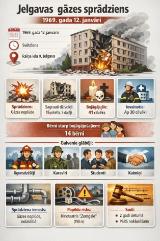 Kādā piecstāvu namā Jelgavas centrā 1969. gada 12. janvāra rītā valdīja priecīga rosība: vecāki posa bērnus uz Jaungada eglīti Jelgavas pilī, kad pulksten 10:55 atskanēja sprādziens un ēka sagruva. Rezultātā vismaz 41 bojāgājušais, starp kuriem 14 bija bērni, vairāk nekā 30 ievainoto. Trīs bojāgājušo līķus tā arī nevarēja atrast, jo viņi katastrofā pilnīgi sadega.
