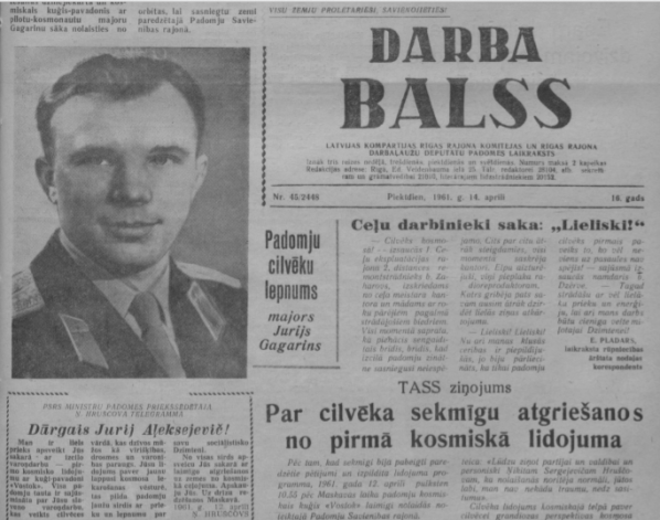 Spilgts piemērs tam ir Rīgas rajona laikraksta “Darba Balss” 1961. gada 14. aprīļa viens no centrālajiem rakstiem, kurš vēsta: “- Cilvēks kosmosā!” - izsaucās 1. Ceļu ekspluatācijas rajona 2. distances remontstrādnieks b. Zaharovs, izskriedams no ceļa meistara kantora un mādams ar roku pārējiem pagalmā strādājošiem biedriem. Visi momentā saprata, ka pienācis sengaidītais brīdis, brīdis, kad izcilā padomju zinātne sasniegusi neiespējamo. Cits par citu ātrāk steigdamies, visi momentā saskrēja kantorī. Elpu aizturējuši, viņi pieplaka radioreproduktoram. Katrs gribēja pats savām ausīm ātrāk dzirdēt lielās ziņas atkārtojumu.