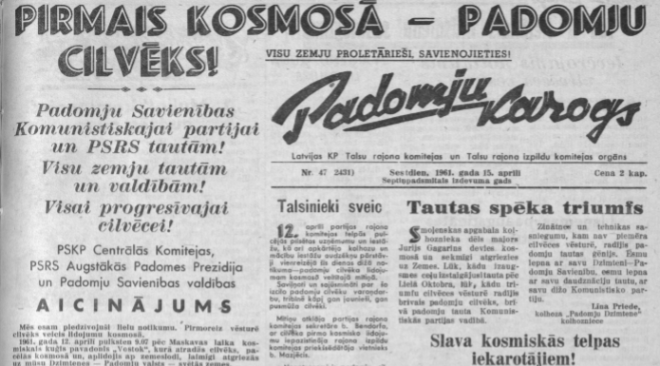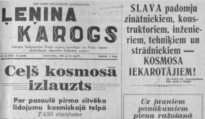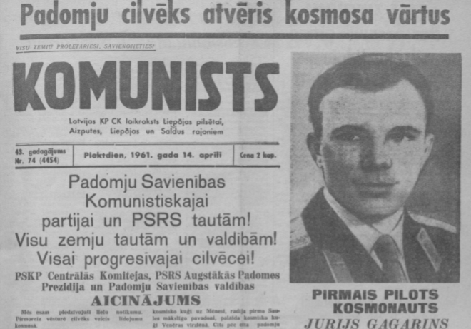 Pirms 58 gadiem laikrakstu pirmās lappuses bija pārpilnas ar teju histēriskām latviešu darbaļaužu kosmoloģiskām izpausmēm. Padomju propaganda bija pārcentīga aprakstos par to, kā latviešu vienkāršie cilvēki krita pārlaimes ekstāzē.
