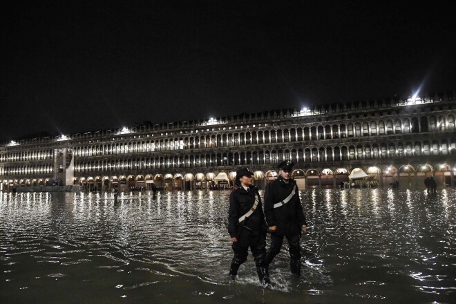 Karabinieru patruļa slapjos zābakos šķērso Svētā Marka laukumu Venēcijā. 12. novembrī teju tropiskas lietusgāzes no Adrijas jūras kārtīgi applūdināja Itālijas dienvidu reģionus un Venēciju – te fiksēts otrai maksimālais līmeņa kāpums – par 183 centimetriem, kas atpaliek tikai no 1966. gada, kad bija 198 centimetri.