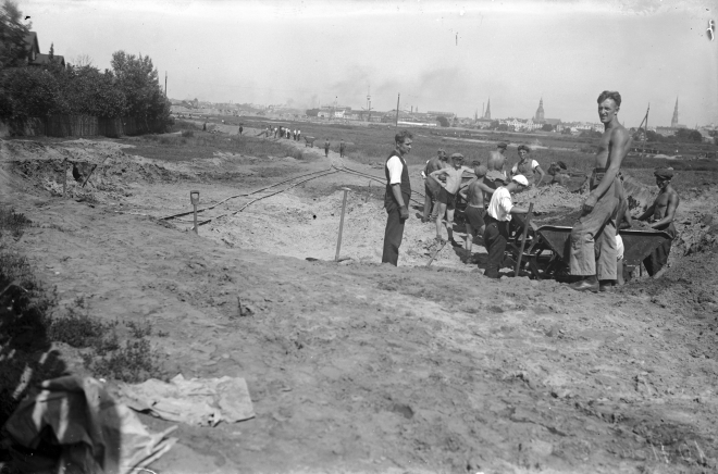 Divdesmitajos gados iecerētā parka līdzināšanas darbi atsākās, taču vēl arvien šī apkaime vairāk atgādināja laukus nekā galvaspilsētas nomali – te ganījās govis un laiku pa laikam norisinājās sporta spēles. Apmēram tāpat viss izskatījās arī trīsdesmito gadu sākumā, kā varam redzēt šajā 1933. gada fotoattēlā. Vēlāk Ulmaņa grandiozos parka iekārtošanas plānus izjauca padomju okupācija, bet astoņdesmitajos tur uzslēja Sarkano armiju slavinošu memoriālo ansambli.