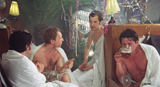Un tātad: pirtī četri vīri izdzēra katrs vairākus kausus alus un trīs pudeles šņabja (cik var saskatīt, etiķete ļoti atgādina Stoļičnaja), pa visiem uzkožot vienu mazo šokolādīti. Ar vienu šokolādīti, protams, ir par maz, lai piebremzētu reibumu, tāpēc drīz vien visi četri ir krietnās burās un dodas uz lidostu. Lidostas restorānā pa visiem izdzer vismaz vienu konjaku (uz galda ir redzama tukša konjaka pudele, bet var jau būt, ka tā nav vienīgā) un sešas pudeles Boržomi minerālūdens. Šajā gadījumā Boržomi dzert ir jau par vēlu – lidmašīnā tiek ietūcīts nepareizais draugs...