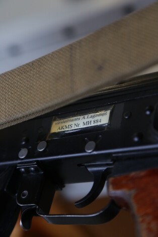 Atmiņas no deviņdesmitajiem gadiem, kad Latvijas armija vēl tikai atdzima. Uzlīme liecina, ka šis Kalašņikova automāts piederējis konkrētam virsniekam – virsleitnantam Lagzdiņam. Pirmajos gados Latvijas militāro struktūru rīcībā bija galvenokārt padomju un sociālistisko valstu ražojuma ieroči, tāpēc dažādu modifikāciju Kalašņikova automāti bija izplatītākie šaujamie. Situācija mainījās laikā, kad Latvija nopietni uzņēma kursu uz iestāšanos NATO un pārapbruņojās ar NATO standartu ieročiem. Bet vecie kalašņikovi kļuva par muzeja eksponātiem.
