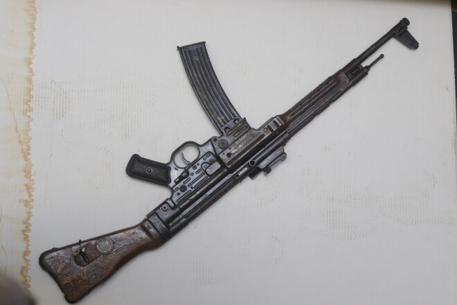 Viens no unikālākajiem Kara muzeja eksponātiem – vācu triecienšautene Stg 44, kas piederējusi kādam nacionālajam partizānam, kurš ar šo ieroci pēckara gados cīnījies pret padomju režīmu. Cīņa bija lemta neveiksmei, un nezināmais partizāns tajā zaudēja, bet viņa ierocis nonāca čekistu rokās. Pēc partizānu kustības apspiešanas triecienšautene nonākusi Latvijas PSR Vēstures muzejā, kas 1956. gadā to atdeva Revolūcijas muzejam. Tur tas gadiem ilgi glabājās slēgtajā fondā. Ierocis ievērojams ar to, ka tā laidi rotā uzraksts “Savu dzimteni turu es svētu”, otrā pusē – “Nāve sarkanām ordām”. Acīmredzot to uzrakstījis ieroča pēdējais īpašnieks. Laide bijusi greznota arī vairākiem apbalvojumiem – Triju Zvaigžņu ordeņa II pakāpes goda zīmi, II šķiras Dzelzs krustu un Latviešu strēlnieku bataljona karavīru nozīmi –, kas ļauj domāt, ka ieroča īpašnieks bijis kaujas rūdīts karavīrs ar abu pasaules karu pieredzi.