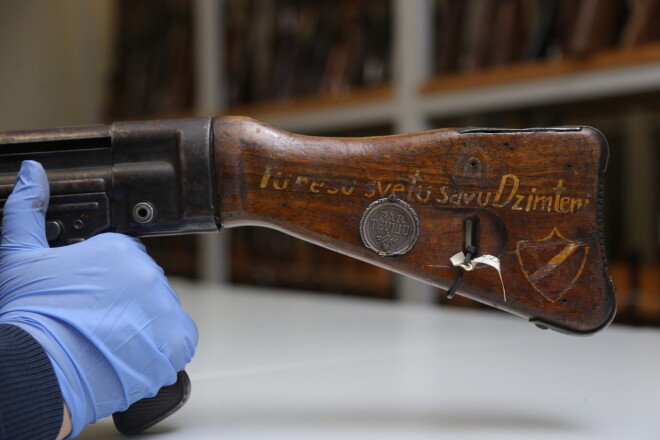 Šis nav vienīgais izgreznotais nacionālo partizānu ierocis, kas nonācis Kara muzeja kolekcijā. Vēl viena triecienšautene Stg 44 ir greznota ar kailas sievietes attēlu un pa pusei iegrebtu uzrakstu “Brīvība”. Pēc pirmajiem četriem burtiem uzraksts apraujas – varam tikai minēt, kādos apstākļos.