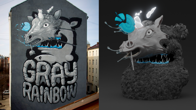 Jūsu ideju uzķēruši arī muzeju īpašnieki, piemēram, Jānis Zuzāns, kurš iegādājās divus tavus darbus – lielformāta gleznojumu Gray Rainbow Grīziņkalnā uz Alauksta ielas 13. nama fasādes un krietni mazāko zilā monstriņa zīmējumu Sky Liverpūlē.
