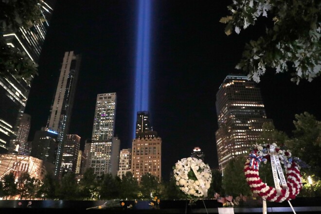 Atminoties baiso un traģisko 2001. gada 11. septembra asinspirti, Ņujorkā, netālu no Pasaules tirdzniecības centra, naksnīgās debesis tika iedegtas spilgtās piemiņas un sēru gaismās.