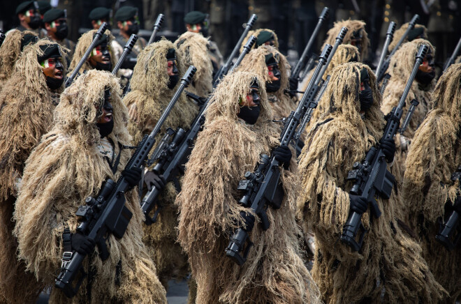 Armijas virsnieki Zokalo laukumā Mehiko mundri maršē vienā taktī gadskārtējās Meksikas neatkarības dienas militārajā parādē.