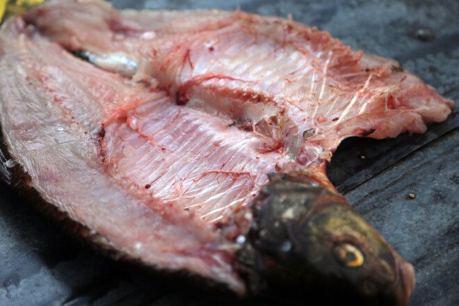 Mūsu intereses objekti bija divi – karpa un breksis. Kā man likās, normāli būtu, ja pieejamie eksemplāri būtu attiecīgi 4 un 2,5 kilogramu svarā. Cik zināms, svaigākās un treknākās pasažieres no plauktiem un baseiniem izzūd pirmās, tāpēc darbdienas rītā tirgū bijām laikus kā runči – īsi pirms deviņiem. Izrādījās, varējām arī nesteigties... Bilde ar vietējām zivīm ir ļoti bēdīga, lai neteiktu – katastrofāla. Uzskaitīšu mūsējo saldūdeņu aborigēnes, kuras tur sastapu – pārsvarā karūsas, brekši, līņi, daži aizdomīgi sīki un strupi zandartēni (stabili vismaz puse bija zem atļautajiem 45 centimetriem – bet neba jau mērīt biju nācis), kāds pakaltis zutis, raudas –, un tas laikam arī viss.