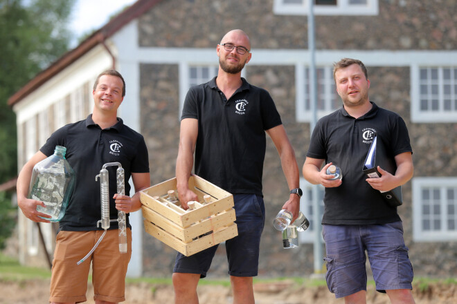 Valdis Madernieks, Jurģis Zvirgzdiņš un Uģis Trofimovs Cesvainē brūvē džinu.