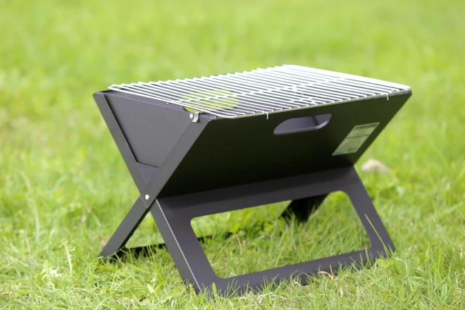 Mūsu testa lielākais atklājums. Kad veikalā paņēmu plāno kasti, uz kuras bija uzzīmēta kaut kāda atlokāma konstrukcija, neloloju cerības, ka no tās varētu sanākt kaut kas prātīgs. Taču, kad atvēru iepakojumu, tad izrādījās, ka tur ir divas savienotas portfeļa izmēra (kāds vēl atceras vecos “diplomātus”?) metāla plāksnes, ko ar vienu rokas kustību var atlocīt, radot elegantu vanniņu. Lai tā neizjuktu, atliek vien nostiprināt divus stūrīšus. Pa virsu uzliekam režģi – un grils gatavs!