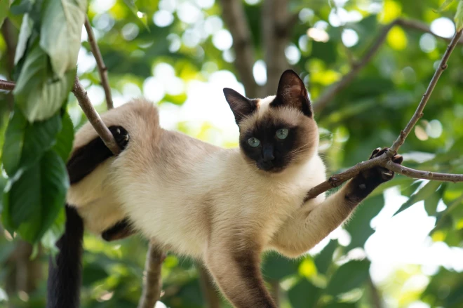 Apraksts: Siāmieši, tāpat kā bobteili, ir nākuši no Āzijas, precīzāk – Taizemes, un tiek uzskatīti par vienu no vecākajām un populārākajām kaķu šķirnēm pasaulē. Tai ir slaids, muskuļots ķermenis un svars var sasniegt pat septiņus kilogramus. Raksturīgas šķirnes īpašības – gaišzilas acis, trīsstūra galvas forma un interesanta spalvaskrāsa. Siāmieši ir ļoti gudri un tikpat uzticīgi savam saimniekam. Pērnā gadsimta sešdesmitajos gados divas Siāmas kaķenes, kuras piederēja sūtnim Henrijam Gelbam, viņa kabinetā Nīderlandes vēstniecībā Maskavā atklāja 30 sienā noslēptus miniatūrus mikrofonus. Šie kaķi ļoti alkst uzmanības un, pamesti mājās vieni, var uzvesties kā mazgadīgi alu sadzērušies huligāni.