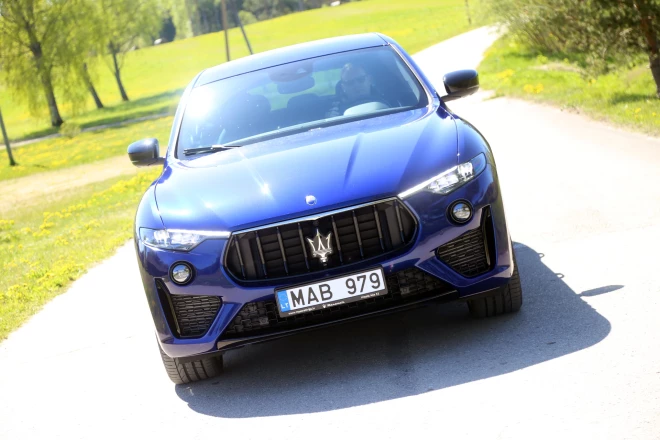 Ja šim skaisti zilajam auto uz sāniem uzvilktu dzeltenas svītras, tad iznāktu viens riktīgs ukraiņu spēkrats, jo tā motora pārsegu rotā gandrīz tāds pats trijžuburis kā Ukrainas ģerboni. "Deviņvīri" izmēģina sportisko "Maserati Levante".