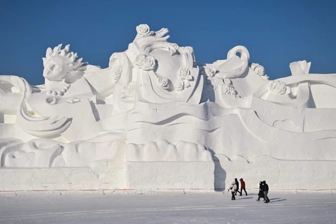 Apmeklētāji ar cienīgu bijību nolūkojas uz majestātiskajām ledus skulptūrām 39. Starptautiskajā Ķīnas Sniega un ledus festivālā.