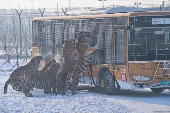 Pieci draudzīgi lielkaķi, lai dabūtu ko gardu, ir aplenkuši safari tūristu autobusu, kas ir iebraucis Sibīrijas Tīģeru parkā uz ziemeļaustrumiem no Harbinas pilsētas.