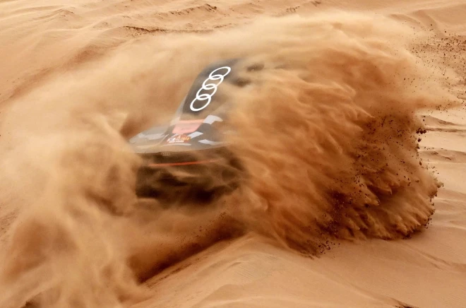 Šādi tuksneša smilšu zobos izskatās "Audi" spāņu ekipāža ar pilotu Karlosu Sainsu un stūrmani Lukasu Krūzu Dakaras 2023. gada rallija 8. posmā starp Al Duvadimi un Saūda Arābijas galvaspilsētu Rijādu.