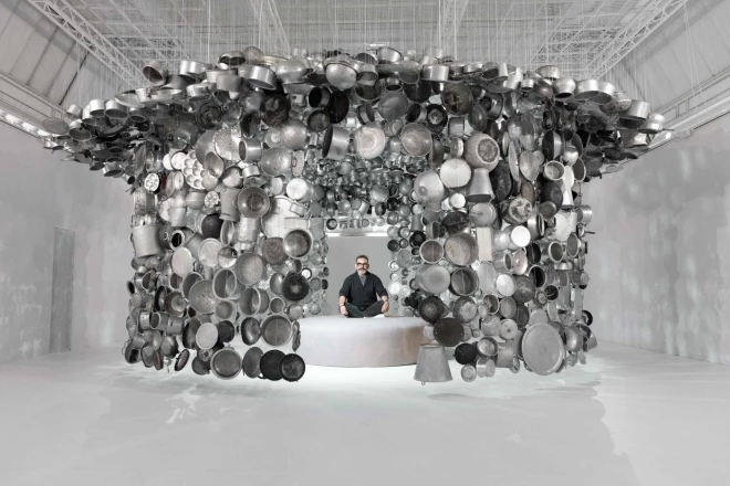 Indiešu performanču meistars Subods Gupta pozē savas instalācijas centrā “Samgan” izstādē Parīzē. Kā redzams, savā mākslas darbā viņš ir izmantojis jebkura laba restorāna virtuves cienīgu artilēriju – pannas, kastroļus, milzu paplātes un pat spaiņus.