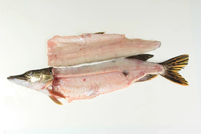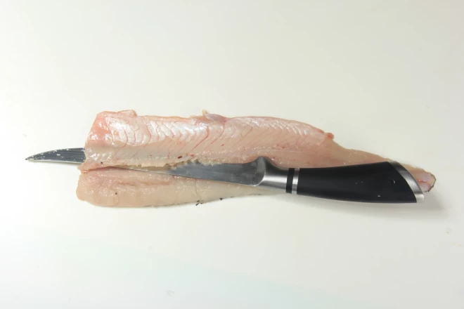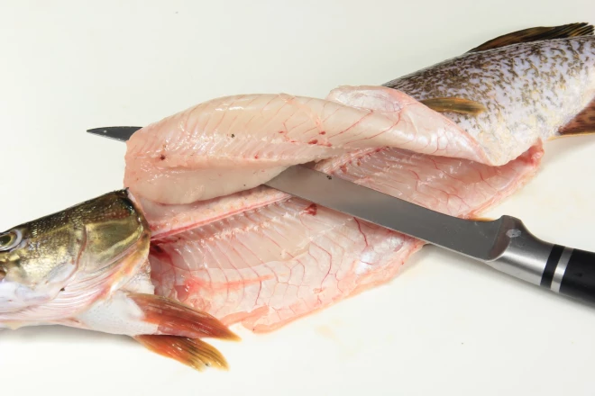 Labi, tagad ejam otras pasaules virzienā. Pirmais. Ar labu filejnazi (12–20 eiro) griežam abpus mugurkaulam no galvas pamatnes līdz astes galam tā, lai izveidotos divas zivs puses. Otrais: izņemam lielo mugurasaku kopā ar monstra galvu – tā lieliski noderēs zupai vai zivs buljonam. Trešais. Taisām nelielu iegriezienu katrai no abām pusēm astes lejucī un tālāk, viegli piepalīdzot ar nazi, velkam nost ādu ar visām zvīņām uz galvas pusi – gluži kā kapuci! Pirmajā reizē var aizķerties, bet, kad piešaujas, šo manipulāciju var veikt pat sekunžu laikā! Ceturtais – ar šķērēm vai pinceti izņemam visas redzamās lielās un mazās asakas un gatavojamies pēdējam cēlienam!