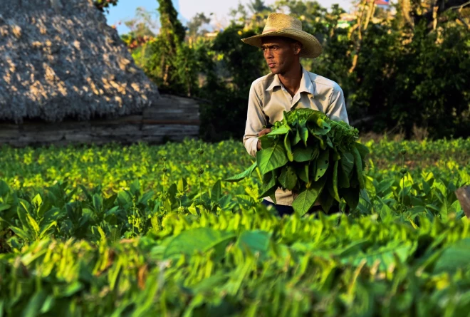 Kopš pērnā gada pasaulē ļoti strauji ir pieaudzis Kubā ražoto cigāru eksports. Bildē redzams vīrs, kurš ievāc kuplo tabakas ražu Vinālas plantācijā Pinalas del Rio provincē.