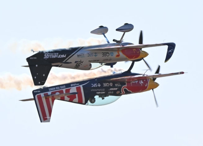 Divi "Red Bull" lidojošā cirka piloti, Mets Hals un Emma Makdonalda, sastiķējuši savus lidaparātus visai pikantā kompozīcijā. Šos augstākās pilotāžas manevrus viņi demonstrēja Avalonas lidostā gadskārtējā Austrālijas aizsardzības ministrijas organizētajā šovā "Defence Expo".