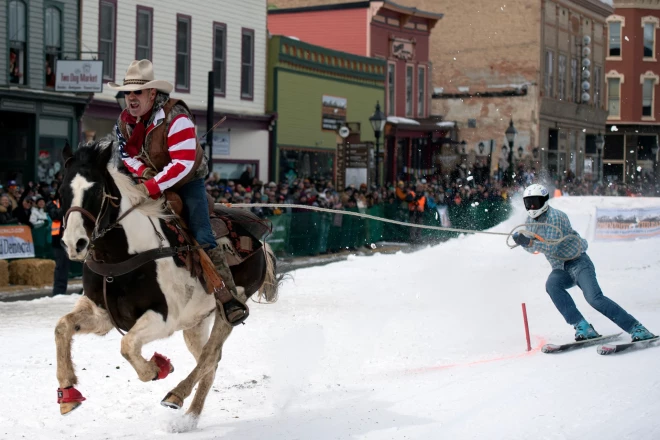 Mēs esam pieraduši, ka slēpotāju vizina auto vai mocis. Taču Kolorādo štata Līdvillas iedzīvotāji līdzīgu izklaidi organizē jau 75. gadu, un viņiem slēpju dīdžeju 3000 metru distancē uz priekšu velk jātnieks ar savu rumaku. Kovbojs Džefs Dāls šajā pasākumā piedalās jau 28. reizi!