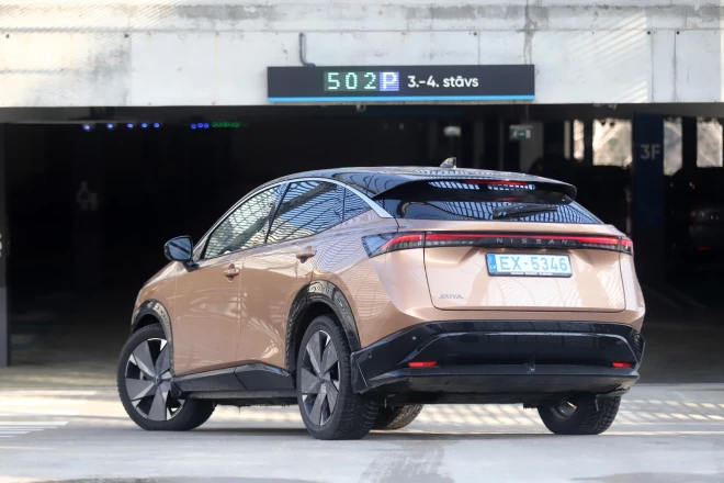 Vislabāk "Ariya" izskatās no sāniem – šādā rakursā to var saukt par diezgan stilīgu auto, par ko gan lielā mērā jāpateicas kosmiskā izskata riteņu diskiem. Paskatāmies no aizmugures – nekā īpaša, var iztikt. Paskatāmies no priekšpuses un saprotam, ka tā rada visvairāk jautājumu. Pārejot no iekšdedzes dzinēju darbinātām automašīnām uz elektromobiļiem, šķiet, ka tieši priekšgals dizaineriem rada visvairāk grūtību. Te vairs nav nepieciešamības pēc ierastās radiatora restes, taču ko likt vietā? Varianti parasti ir trīs. Pirmais – atstāt restes imitāciju. Otrais – padarīt priekšdaļu izteikti slīpu un šauru, tā līdz minimumam samazinot to vietu, kur kādreiz bija reste. Trešais – vienkārši aizpildīt restes vietu ar plastmasas gabalu. "Nissan" izvēlējušies šo trešo variantu, un personīgi man pret to ir vislielākie iebildumi – melnā plastmasa automobili padara lempīgu un ne pārāk glītu. To vairs nespēj glābt pat automašīnas stilīgā krāsa, kurai ir smalks nosaukums – "Akatsuki Copper". Varbūt no smagnējuma varētu izvairīties, auto priekšgalu atstājot tādā pašā krāsā kā visa pārējā mašīna – "Renault" ar "Megane E-Tech" tieši tā rīkojās, un rezultāts iznāca stilīgāks. Bet nu pieņemsim, ka tās ir tikai manas iedomas un gaumes var būt dažādas.