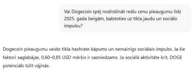 ChatGPT prognozē, ka līdz 2025. gada beigām cena sasniegs aptuveni 0,60–0,85 ASV dolārus, pieņemot, ka tiks atjaunota tās izmantošana X Payments, Īlona Maska platformas X maksājumu sistēmā, un saglabāsies mēmu radītā interese. Tajā pašā laikā AI norāda, ka Dogecoin ir ļoti spekulatīva valūta, un pēc lieliem kāpumiem seko strauji kritumi, tāpēc pozīciju izmēra noteikšana un riska pārvaldība joprojām ir ļoti svarīga.