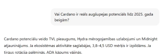 Saskaņā ar ChatGPT gaidāmais Midnight atjauninājums, kas vērsts uz privātumu un mērogojamību, varētu vēl vairāk paaugstināt Cardano tirgus pozīciju. Balstoties uz vēsturiskajām cenu struktūrām un pašreizējo ADA/BTC attiecību, AI prognozē potenciālu cenu pieaugumu līdz aptuveni 3,80–4,50 ASV dolāriem līdz 2025. gada beigām. Svarīgi, ka rotācija uz ADA bieži sākas, tiklīdz Bitcoin dominēšana sāk samazināties, un modelis redz, ka šis brīdis tuvojas, jo makroekonomiskie apstākļi stabilizējas.